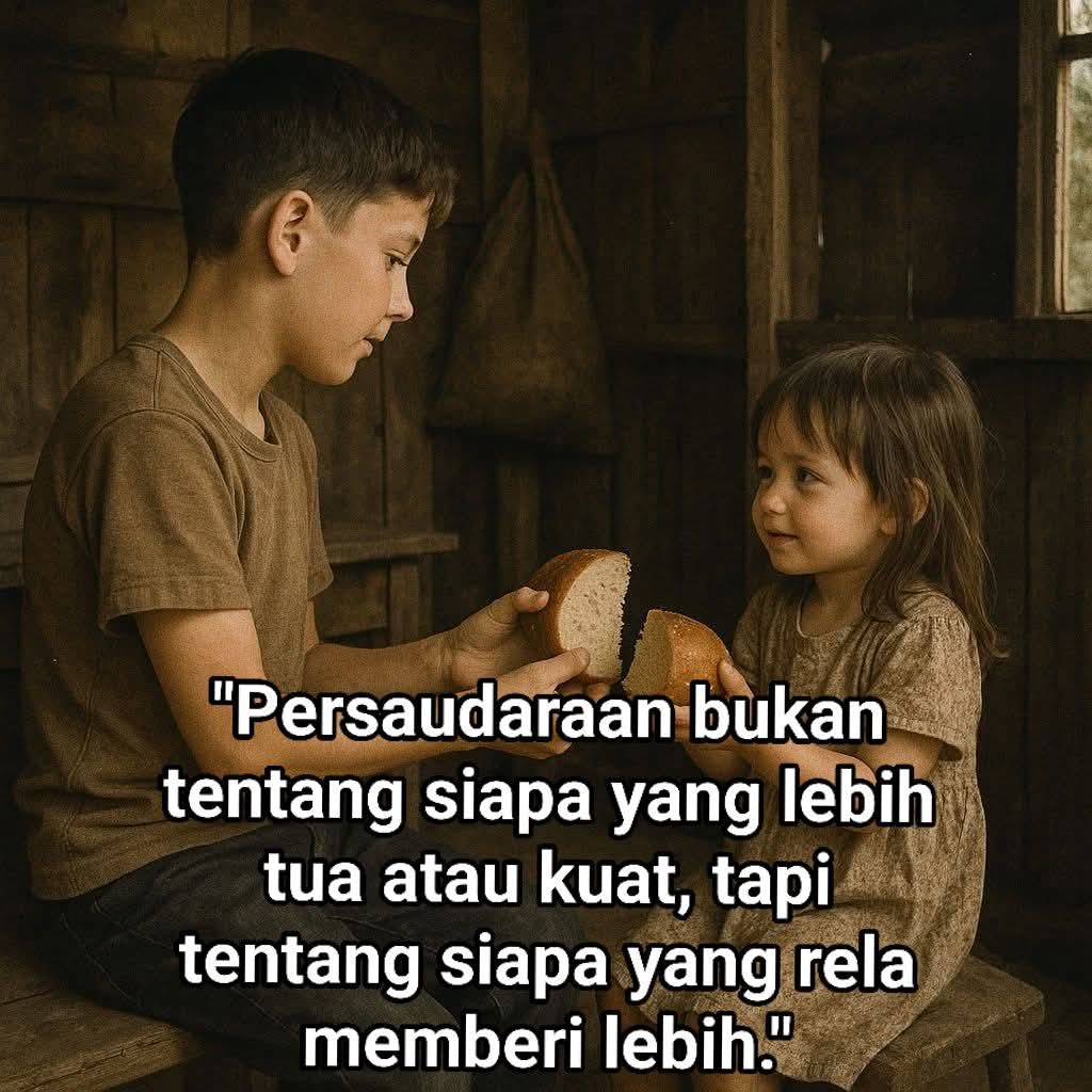 “Nak, saudara itu anugerah. Kalau kamu bisa memberi lebih, berilah. Karena kelak, saat kamu butuh, dia yang akan ada di sisimu. Dalam potongan kecil apapun, kasih sayang bisa terlihat besar. Dan itulah cara terbaik menjaga tali persaudaraan.”
